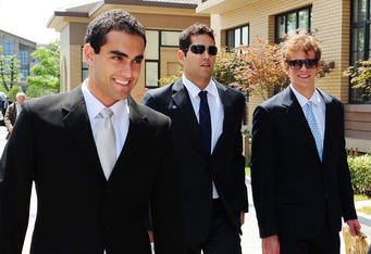 | Cielo (D) e colegas de equipe, Waked e Barbosa, também envolvidos, chegam ao tribunal. Nadadores foram flagrados em exame antidoping pelo uso de furosemida (Foto Mark Ralston, AFP) |