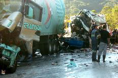 Mais um acidente bloqueou a BR-376, na altura do Km 673, na região de Guaratuba, quase na divisa com Santa Catarina. Desta vez, um casal morreu com o impacto da batida. José Antonio Rosa Maciel, 34 anos, da cidade de Lobato, aqui do Paraná, dirigia o caminhão em companhia da esposa e acabou batendo o veículo na traseira de outros dois, na descida da Serra. Esses dois caminhões, por seu lado atingiram uma quarta carreta e também um veículo Blazer. José e a esposa, ainda não identificada, morreram no local. Os outros três motoristas de caminhão e os quatro ocupantes da Blazer, nada sofreram. A Polícia suspeita que o caminhão de José tenha perdido o freio. As três faixas sentido Sul ficaram bloqueadas devido a colisão entre quatro carretas e um veículo. O tráfego ficou parado completamente entre o Km 656 e o Km 673, quando uma pista foi liberada, por volta das 19 horas desta sexta-feira. A liberação total da pista s[o ocorreu por volta das 21 horas. (Polícia Rodoviária Federal)
